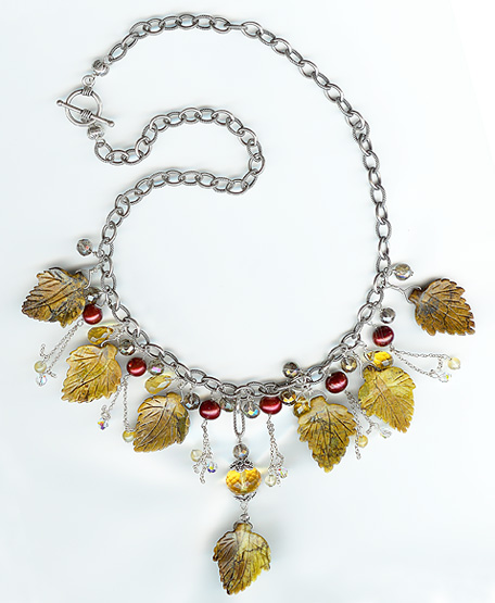 Item #0518 Jasper Leaves Necklace Carved Picture Jasper Leaves, Smokey Quartz (AB), Fresh Water Pearls, Carnelian, Swarovski Crystal, Citrine (Lab), Sterling Silver Beads, Chains & Clasp. Length 20"
