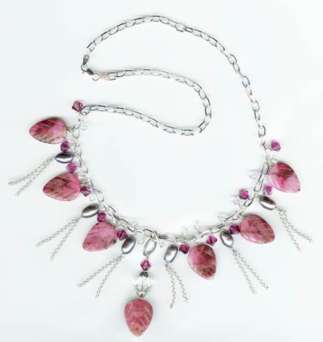 Item #0526 Rhodonite Leaves Necklace Item #0527 Earrings Rhodonite, Fresh Water Pearls, Rock Crystal, Swarovski Crystal, Sterling Silver Chains & Clasp. Length 16"