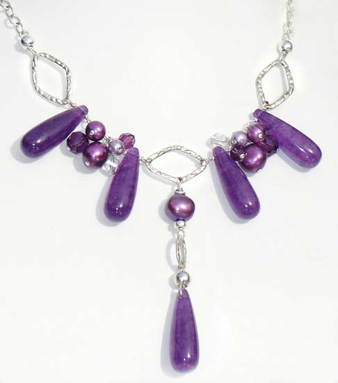 Item #0447 Amethyst Drops Necklace Amethyst Drops, Freshwater Pearls, Swarovski Crystal, Sterling Silver beads, chain, and clasp. Length 18" to 22"