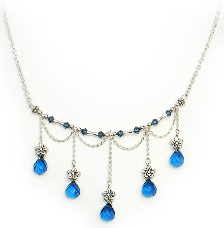 Item #0420 Blue Quartz Briolette Necklace Blue Quartz Dangles, Swarovski Crystal, Sterling Silver Beads, Chain & Clasp. Length 18"
