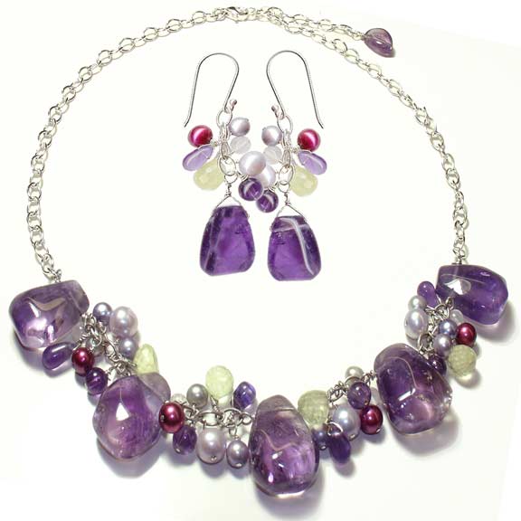Item #0507 Amethyst Nuggets Necklace Item #0508 Earrings Amethyst Nuggets & Beads, Facetted Prehnite Briolettes, Freshwater Pearls, Sterling Silver, chain, and clasp. Length 16" to 19"