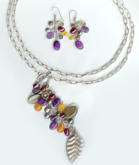 Item #0522 Purple Medley Lariat Item #0523 Earrings Amethyst, Smokey Quartz, Sugilite, Fresh Water Pearls, Citrine, Sterling Silver Chain.