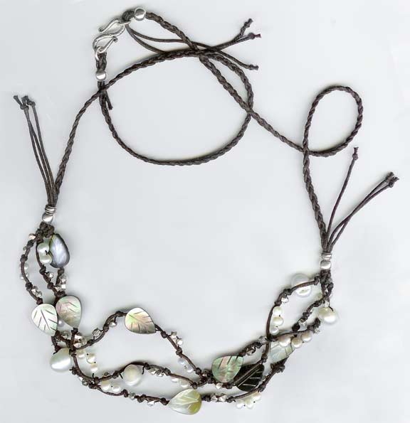 Item #0534 Braided Leaves Necklace Shell leaves, Freshwater Pearls, Braided Hemp Rope, Sterling Silver beads and clasp. Length 24" to 26"