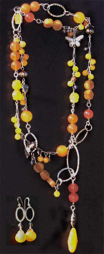 Item #0437 Yellow Orange Jade Lariat Item #0537 Earrings Yellow & Orange Jades Beads, Sterling Silver beads, links, chain, and clasp. Length 34"